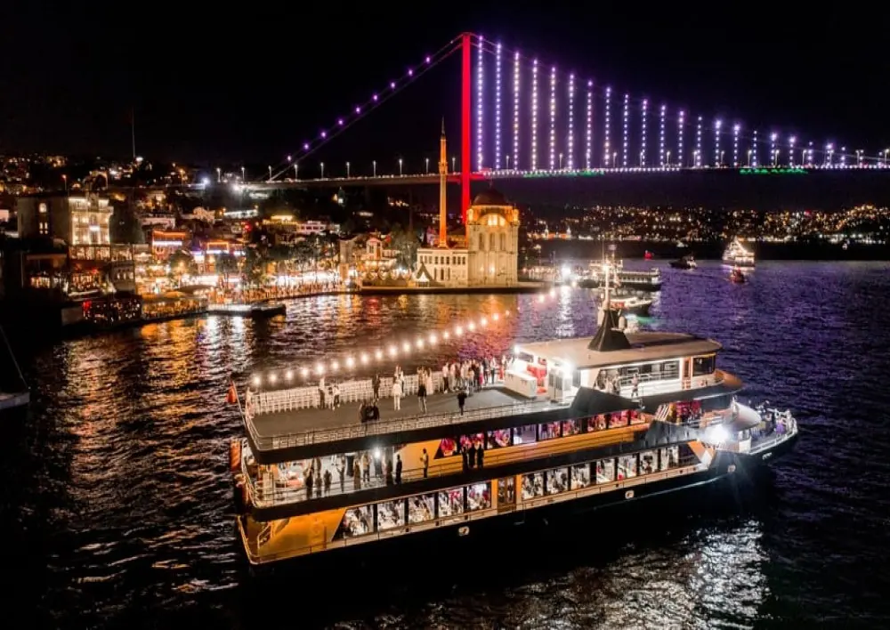 Once the boat departs, Istanbul’s landmarks slowly pass by – Dolmabahçe Palace, Çırağan Palace, Ortaköy Mosque, the Bosphorus Bridge and the mansions lining both shores. A Turkish set menu is served at your table: cold and hot meze starters, a grilled or baked main dish (usually fish or meat, with a vegetarian option on request), and a local dessert with tea or coffee. You can move freely between your table and the open deck to enjoy the views.